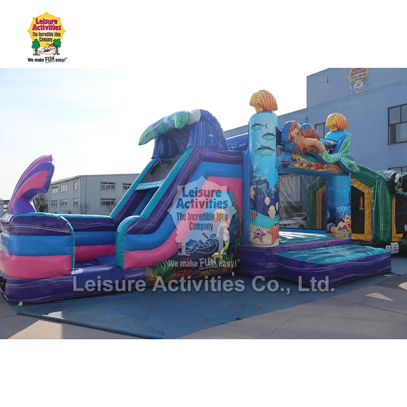 پانی کے اندر کی مہم جوئی میں غوطہ لگائیں,یہ سپر انفلٹیبل ملٹی پلے مرمیڈ باؤنسی کیسلز، سورج اور بارش سے تحفظ کی چھت کے ساتھ مکمل، یورپی مارکیٹ میں ایک مقبول انتخاب ہے۔ یہ خشک سلائیڈ اور واٹر سلائیڈ دونوں کے طور پر کام کرتا ہے۔ ایک حفاظتی سورج اور بارش کی چھت کے ساتھ مکمل، یہ لامتناہی تھیمڈ تفریح ​​کے لیے پانی کے اندر ایڈونچر کو زندگی میں لاتا ہے۔